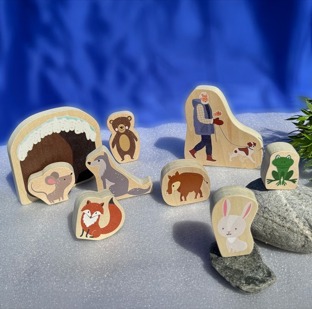 Denne pakken med konkreter inneholder 1 mann med hund, 1 skinnvott, 1 mus, 1 frosk, 1 hare, 1 rev, 1 ulv, 1 villsvin og 1 bjørn, totalt 9 klosser.