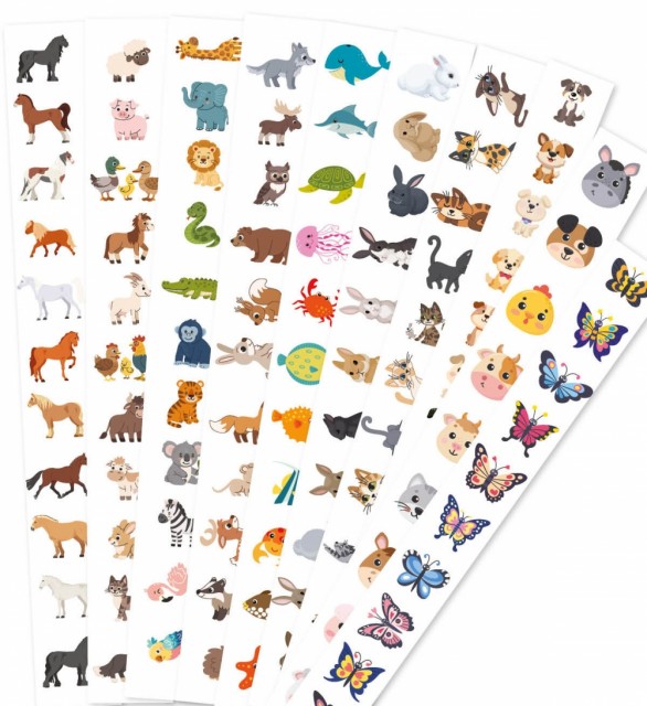 Spennende klistremerkepakke som inneholder: Gårdsdyr, Jungeldyr, Skogsdyr, Havdyr, Kaniner, Katter, Hester, Hunder, Dyreansikter, Sommerfugler
