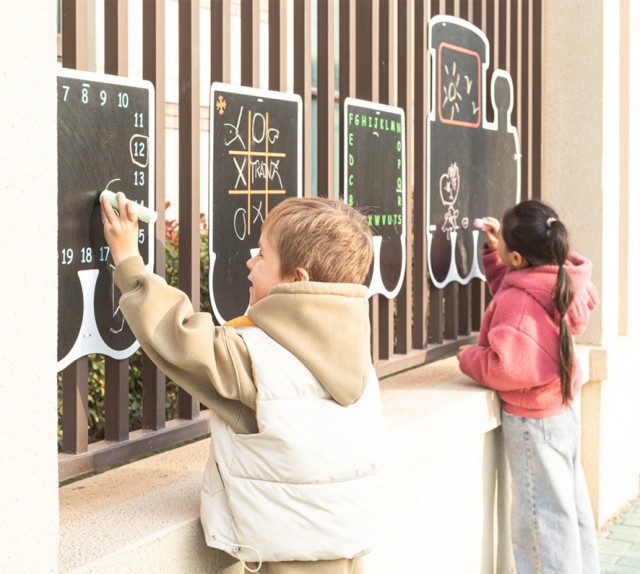 Krittavlene kan monteres på gjerde eller vegg og gjør uteområdet til et kreativt samlingspunkt for barna.