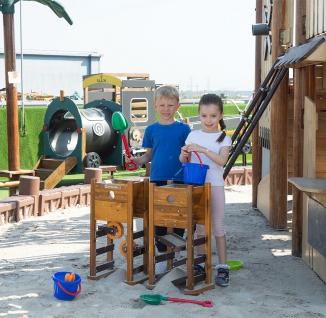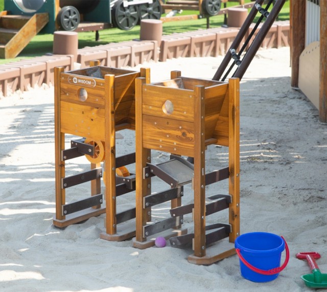Dette sandlekesettet består av to tårn med sandrenner som kan åpnes for å styre sanden nedover. Barna kan fylle sand i toppen og se hvordan den beveger seg gjennom systemet. De roterende hjulene gjør leken enda mer spennende og gir barna mulighet til å påvirke sandens vei. Et kreativt og lærerikt uteleketøy som inspirerer til utforsking og samarbeid.