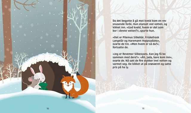 En liten vott blir et varmt hjem for mange dyr iskogen. Først kommer én, så to, så tre – helt til det nesten ikke er plass til flere! Et koselig eventyr som inviterer til telling,gjentakelser og mye moro under høytlesningen.