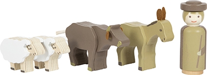 • Krybben inkluderer to trær som kan festes sammen, en trestall med en stjerne som kan settes inn, tre kameler, et esel, en okse og to sauer.