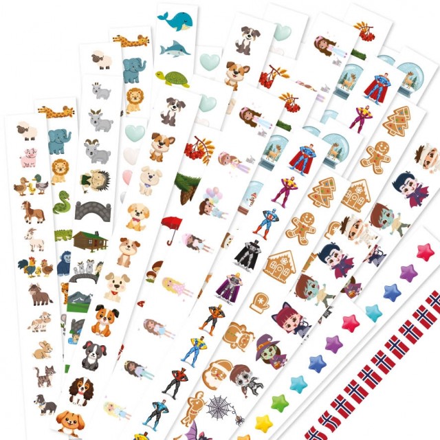 En variert pakke med: Gårdsdyr, Jungeldyr, Skogsdyr, Havdyr, Kaniner, Katter, Hester, Hunder, Dyreansikter, Sommerfugler, Nødetater, Tøffe biler, Personbiler, Monstertrucks, Anleggsmaskiner, Gullhår, Bukkene bruse, Pirater, Prinsesser, Superhelter, Havfruer, Drager, Enhjørninger, Feer, Fantasidyr, Hjerter og stjerner i ulike varianter, årstidsklistremerker (høst, vinter, sommer, vår), Bursdag, Dinosaurer, Emojis, Matvarer, Påskemix, Påskeegg, Regnbuemix, Jenter, Verdensrommet, Vårblomster, Norske flagg, Frukt og grønnsaker, Halloween, Blomster.