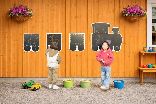 Krittavlene kan monteres på gjerde eller vegg og gjør uteområdet til et kreativt samlingspunkt for barna.