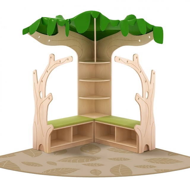 Dette lesehjørnet er formet som et tre, og skaper en helt unik atmosfære i rommet. Det er utformet med grener som kan pyntes, og et stofftak som gjør det ekstra lunt og koselig.